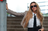 - Con pantalones de vestir y una blusa para un estilo más formal.